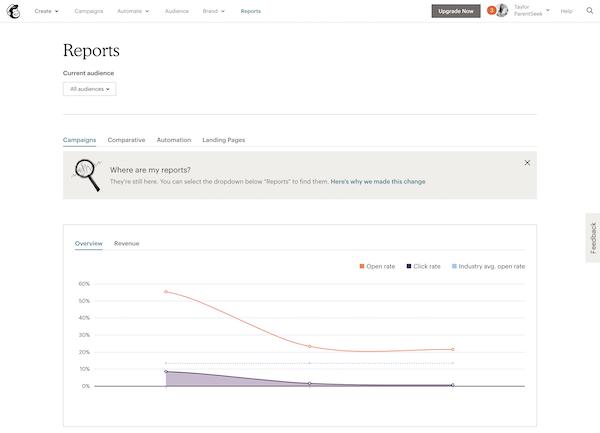- Click the report for the email campaign you want to view. This takes you to the Report Overview, where you’ll see the following: